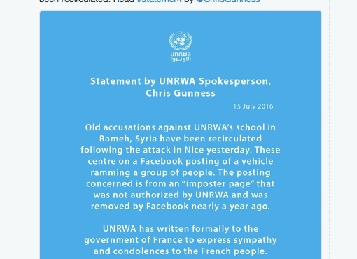 דובר אונר"א , כריס גאנס, הגיב שוב לדברי UN Watch כשהוא ממחזר את ההכחשות הבלתי הסבירות שלו תחת פוסט פייסבוק שלנו מהשנה שעברה החושף את ההסתה של אונר"א  בבית ספר סורי לביצוע פיגועי דריסה, בדומה לפיגוע שזה עתה קרה בניס שבצרפת. גרסתו של מר גאנס היא מגוחכת. למה שמישהו יטרח לפתוח חשבון- "מזוייף" תחת השם בית ספר אונר"א במחנה ג'רמאנה מחוץ לדמשק- כשכל כך הרבה אנשי אונר"א בגלוי מסיתים לאותם פיגועים?