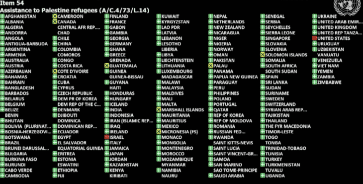 - Operations of the United Nations Relief and Works Agency for Palestine Refugees in the Near East [A/C.4/73/L.16]: Adopted by a vote of 158 – 5 – 7