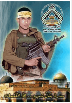 UNRWA teacher Ghoban posted this violent image with the two-gun logo of the Al Aqsa Martyrs Brigade, a terrorist group responsible for dozens of suicide bombings, including at a Tel Aviv bus station and other civilian targets. The text refers to the “Zionist enemy.” Image 1