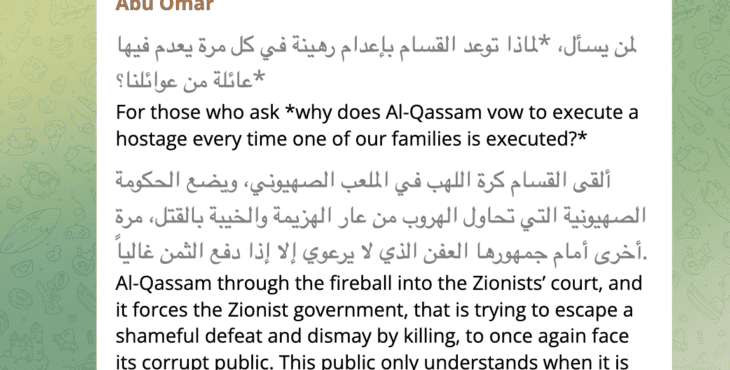 On October 8th, Abu Omar celebrated and endorsed the previous day’s massacres, which he described as “our youths [Hamas terrorists] break their evil into pieces.” He repeatedly praised God for the Hamas success, elated that “their [Israeli] thrones are shaking,” “their [Israeli] state is collapsing,” “our mujahidin are roaming through the land [Israel],” and concluded by proclaiming that “our youths [Hamas terrorists] will utterly destroy whatever falls into their hands.” Abu Omar similarly endorsed the Hamas atrocities on October 12 when he wrote that 30 of his own friends and family had become “martyrs,” and he does not want “their work and what they did [i.e., their terrorists atrocities in Israel] to become scattered dust.” Therefore, he pleaded for patience so that “we” can achieve “victory.” When, on October 9th, Hamas threatened to execute hostages—a war crime—Abu Omar endorsed this as a valid tactic to get the Israeli public to pressure the government to cease its military campaign in Gaza. On December 5th, Abu Omar glorified the Hamas terrorists as “mujahidin fighting like lions in the battlefield.”