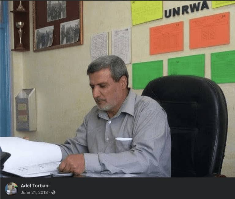 Adel Torbani lists himself as a math teacher at UNRWA. His profile photo shows him sitting at a desk with the UNRWA logo on the wall behind him. He rejects Israel’s right to exist and describes Jews as rapists of the land, deceitful and greedy.