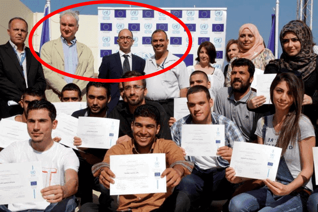 Below is Matthias Schmale, currently UNRWA’s New York director, seen with Abel Piqueras Candela, EU Representative to Lebanon, both standing right next to UNRWA school principal Ahmad Nasser. At the time, Schmale was UNRWA’s country director for Lebanon, and is likely to have known and interacted with this pro-Hitler head of an UNRWA training center.