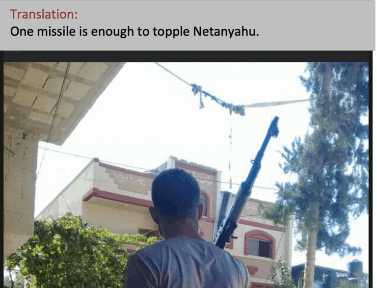This UNRWA teacher’s profile contains numerous photos of him practicing with automatic weapons, indicating support for violence and possible membership in a terrorist organization. A post from September 15, 2019, specifically endorses rocket attacks on Israel—“one missile is enough to topple Netanyahu.” A number of terrorist rockets and mortars were fired from Gaza into Israel in September 2019, including one that sent Netanyahu running for shelter during an election campaign rally in the southern Israeli city of Ashdod. A June 2019 photo shows the UNRWA teacher aiming his weapon with the hashtags “#We await the sign; #Allah; #The one seeking help,” indicating he is ready to shoot as soon as he receives the instruction. The hashtags were later removed.
