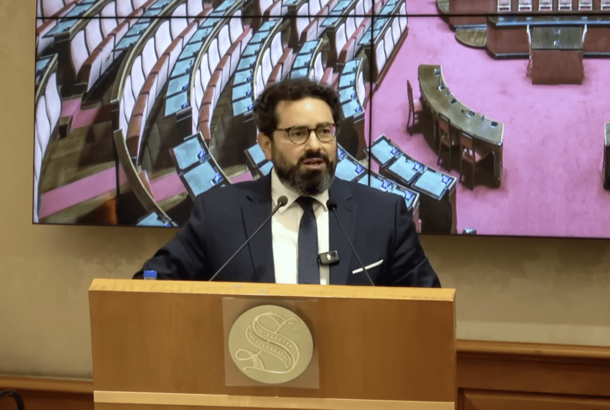 Hillel Neuer, at podium left, presenting UN Watch’s latest report before a packed hall in the Italian Senate.