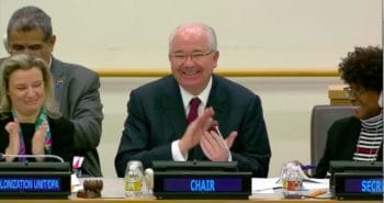 Video above: Syrian ambassador Bashar Ja’afari was re-elected by acclamation as Rapporteur by the UN special committee, hugged by the new Venezuelan Chair, Rafael Darío Ramírez Carreño, and then