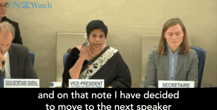 En la sesión del 18 de marzo de 2019 que se enfocaba solamente en condenar a Israel, quien dirigía el debate en el Consejo de Derechos Humanos de la ONU interrumpió a Hillel Neuer, de UN Watch por solamente intentar leer los nombres de los países que hablaron y que, tal como él le dijo a la asamblea, «lo decía todo»