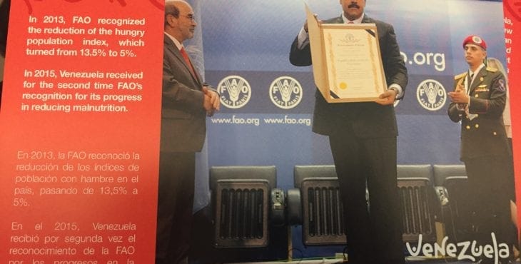 Selon le document de synthèse de l’ONU, en dépit de la famine au Vénézuela, un groupe slovène s’appelant l’Association des “choses évidentes” (Association for Obvious things) a salué le Vénézuela du fait que le pays a été « reconnu par l’Organisation des Nations Unies pour l’alimentation et l’agriculture (FAO) pour avoir surpassé le premier objectif de développement du millénaire consistant à réduire de moitié la faim. » (Voir le compte rendu intégral ici.)