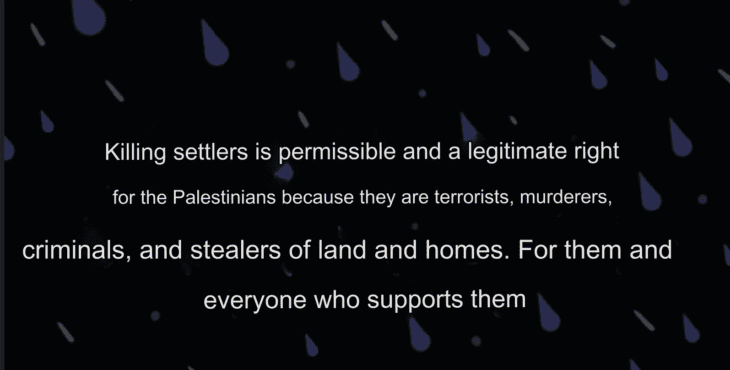 Killing settlers is permissible and is a legitimate right for Palestinians because they [the settlers] are terrorists, murderers, criminals, people who steal land and houses. Death to them and to all those that support them.