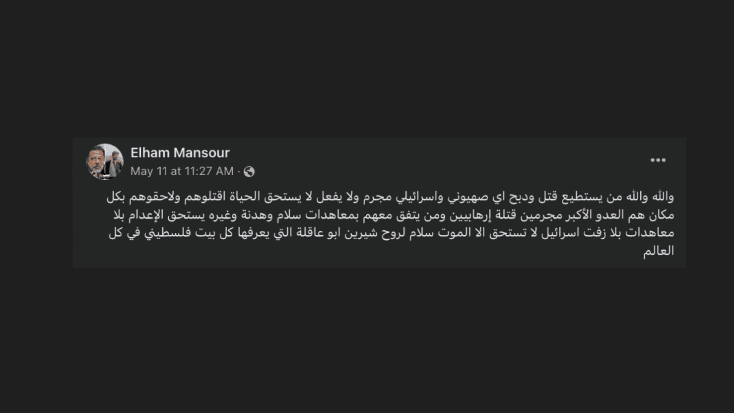 By Allah, by Allah, anyone who can kill and slaughter any Zionist and Israeli criminal, and doesn’t do so, doesn’t deserve to live. Kill them and pursue them everywhere, they are the greatest enemy, criminals, murderers, terrorists… and anyone who signs peace accords, truces and so on with them deserves to be executed. No treaties and no nothing. All Israel deserves is death. Peace to the spirit of Shireen Abu Aqleh, who was known to every Palestinian household everywhere in the world.