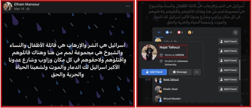 In May 2021, Mansour legitimized attacks on Israelis who live in settlements and their supporters as “permissible” and “a legitimate right” and incited their murder, proclaiming “Death to them and to all those that support them.” Several UNRWA staff liked this post.