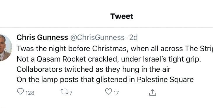 En un tweet del 23 de diciembre de 2019 que fue eliminado hoy, Chris Gunness, que fue portavoz de UNRWA desde 2007 hasta más temprano este año, hizo alusión a las ejecuciones de «colaboradores» por parte de Hamás: