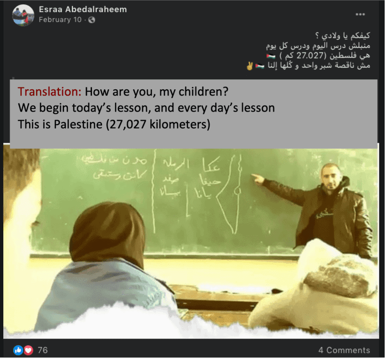 This post from February 10, 2020, features a teacher in front of a class of students pointing to a map on the blackboard that erases Israel. The text of the post affirms that Abedalraheem seeks to teach her students that Israel should not exist because every “inch” of the territory (“27,027km”) belongs to Palestine. The text presents this as “today’s lesson, and every day’s lesson.”