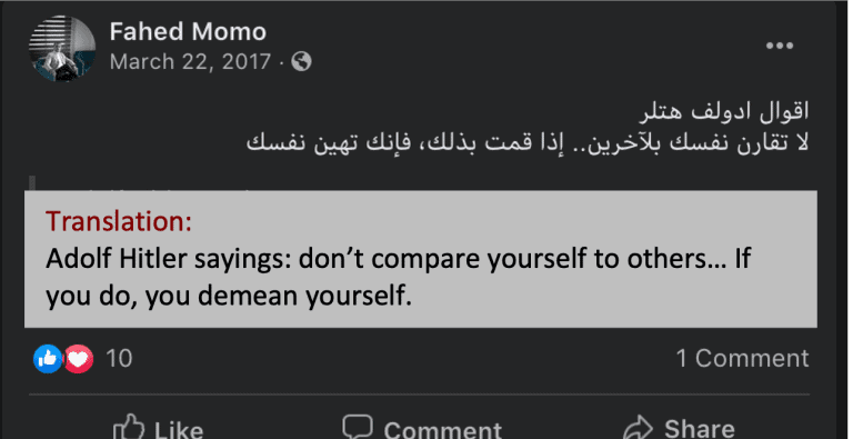A post by Fahed Momo from March 2017 portrays Hitler as wise and inspirational. The post shares advice from Hitler in the form of an alleged quote from the mass murderer: “Don’t compare yourself to others…if you do, you demean yourself.”