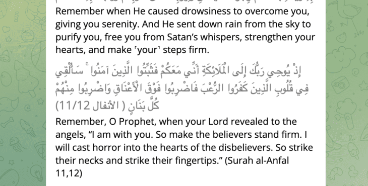 On October 9th, Gaith, one of the UNRWA Telegram group admins, likened the Hamas terrorist massacre in Israel to the Prophet Muhammed’s victorious battle over the “disbelievers” in Badr in the year 624. He quoted a verse from the Quran—“I will cast horror into the hearts of the disbelievers. So strike their necks and strike their fingertips”—and then commented “God we have complied with your command.” Thus, Gaith refers to Hamas’s October 7th massacre as “complying with God’s command.” He then proclaims that Hamas will achieve “victory like the victory in Badr.”