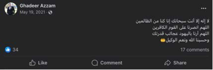 In May 2021, during the last Israel/Hamas war, Azzam prayed for Hamas victory over the Jews, whom he referred to as “the tribe of infidels.” Azzam’s post also beseeched Allah to show his power and “even the score” by what he will do to the Jews.