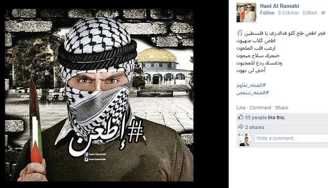 Hani Al Ramahi, who identifies himself on Facebook as a “Projects Support Assistant at UNRWA” (screenshot below), posted the violent image below on October 8th, in which a keffiyeh-clad man stares down the camera as he grasps a knife, bearing the Palestinian colors, daubed in blood. “Stab Zionist dogs,“ reads the caption.