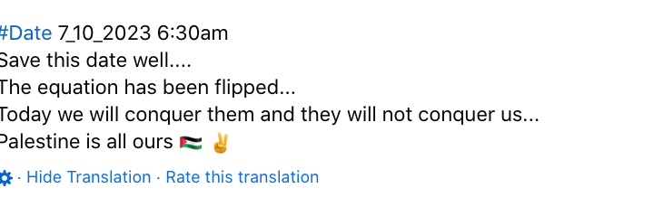 In a separate post two days after the October 7th Hamas massacre, Hanin calls the attack “an honor for the whole nation.”