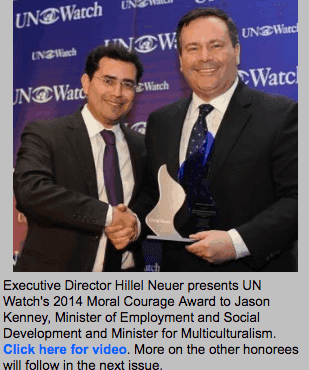 “UN Watch honors Minister Kenney for demonstrating the courage to lead in upholding the founding principles of the United Nations, and defending the true principles of human rights,” said UN Watch executive director Hillel Neuer.