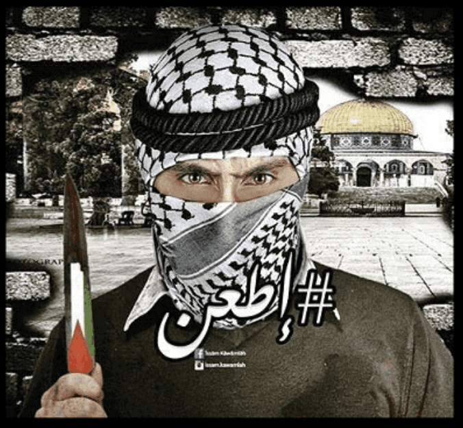 Hiba Miari, an UNRWA teacher, celebrated the recent Palestinian stabbing attacks against Israeli Jews with a cartoon of a masked Palestinian playing music on a giant knife, the kind used for stabbing:
