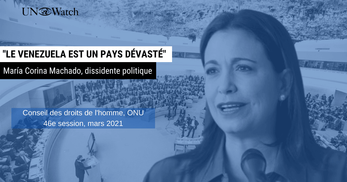 María Corina Machado: “Je suis María Corina Machado, du Venezuela. Je remercie UN Watch de me donner l’occasion de m’adresser au Conseil des droits de l’homme des Nations Unies.