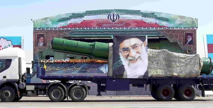 Un camion militaire transportant un missile avec la tête du guide suprême de l’Iran, l’ayatollah Ali Khameneï