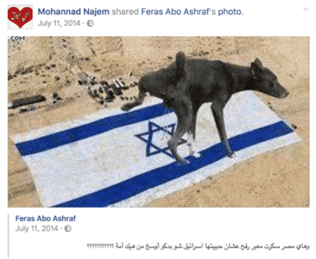 UNRWA teacher Najem shares a photo of a dog urinating on the Israeli flag. Image 1