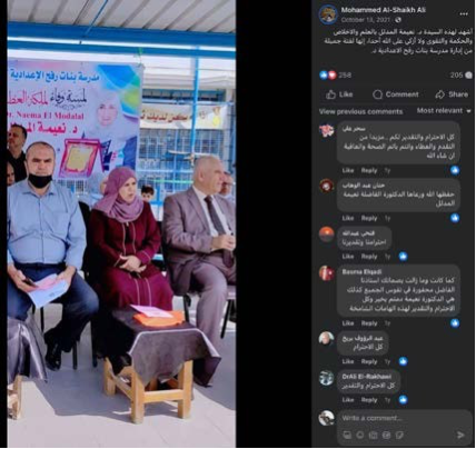 Mohammed Al-Shaikh Ali lists himself on Facebook as an UNRWA employee. He has posted several photos of himself at UNRWAschools, including while presenting UNRWA awards to various individuals. A caption in one of the photos references the Rafah Preparatory Girls School. Ali incites violence against “traitors” who try to leave Gaza during hostilities.