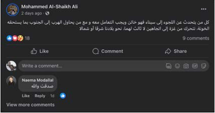 In this October 10th post endorsing Hamas, Mohammed Al-Shaikh Ali assails and threatens Gazans trying to flee the territory through Sinai as “a traitor”who will “be treated the way we ought to treat traitors.” This not only supports Hamas, but endorses its tactic of using civilians as human shields which is a war crime. There is no reason for uninvolved civilians to remain in Gaza during thehostilities except to serve as human shields for Hamas. The post also supports Hamas’ invasion of Israel referred to as “our country,” effectively denying Israel’s existence – “We move from Gaza in two directions, there is no third direction, towards our country, to the east or to the north.”