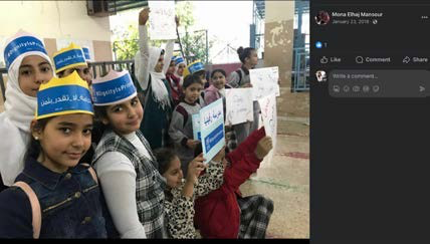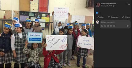Mona Elhaj Mansour lists herself on Facebook as an English teacher at UNRWA. Her profile contains photos of her students inUNRWA classrooms with UNRWA logos.