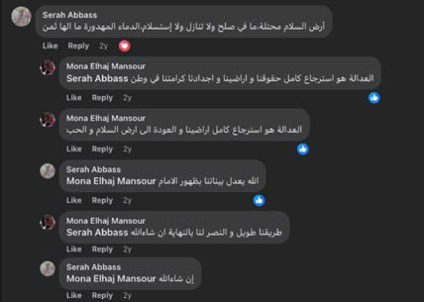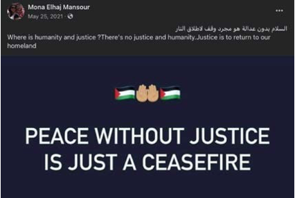 On May 25, 2021, just after the May 2021 Israel/ Hamas conflict concluded, Mona Elhaj Mansour posted that “peace without justice is just a ceasefire,” indicating her position that violence would continue until “justice” is achieved. What she meant by “justice” is clear from comments that she liked on her post. By “justice” Mansour meant restoring “all of our lands,” and “our dignity in the homeland,” i.e., referring to the entire territory which includes Israel. Mansour adds that “there should be no reconciliation, compromise, or capit- ulation.” To achieve that “justice,” “spilled and unavenged blood has no price.”
