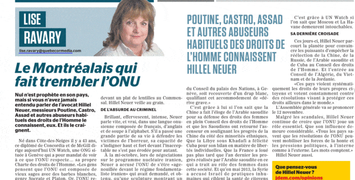 Born in the Côte-des-Neiges neighborhood 43 years ago, the Concordia and McGill graduate is today the executive director of UN Watch, a NGO based in Geneva whose mandate is to ensure that the UN respects… its own Charter.