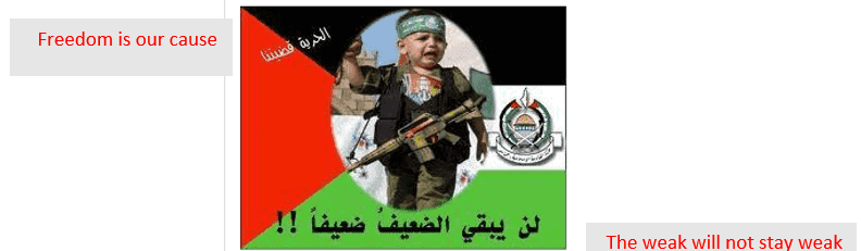 Muhammad Abu Nasr, who identifies himself on his Facebook profile as a teacher at UNRWA, published the image below of a small child garbed in military wear and with a gun slung around his neck, superimposed on an image of the Palestinian flag, and next to the Hamas logo. He also published a photo of Hamas members hunting down jews.