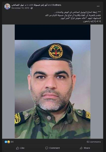 Nabil al-Salahi honored terrorist commander Khaled Moawad Farraj as a “martyr” after he was killed fighting for the PalestinianIslamic Jihad’s Al Quds Brigades. Farraj had carried out numerous bombing and missile attacks on Israeli cities, including Netivot andTel Aviv.
