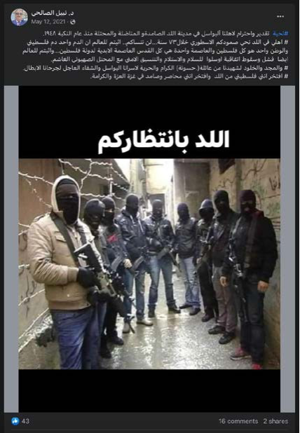 When Arab-Israelis in mixed Jewish-Arab cities across Israel engaged in violent riots during the May 2021 Israel-Hamas conflict, Nabil al-Salahi endorsed the violence and rejected Israel’s right to exist, referring to the Israeli city of Lod and all of Israel as “Palestine.” His May 12, 2021 post expressed solidarity with the Lod rioters, describing the Israeli city as being “occupied” since 1948. Salahi also proclaimed that “it is all Palestine,” referring to Israel, and said that the rioters had proven their “legendary steadfastness” for 73 years, meaning since Israel was created in 1948.