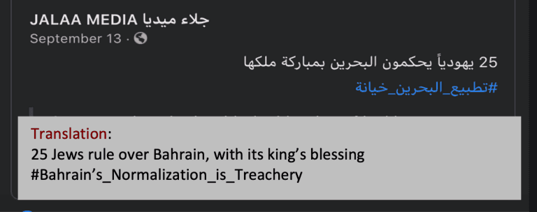 In September 2020, UNRWA employee Nadim Elhaj posted an antisemitic video. The video opposes Israel’s normalization with Bahrain by repeating common antisemitic conspiracy theories about wealthy Jews controlling the world. It asserts that Zionist Jews achieved normalization with Bahrain by using their wealth and influence to develop business relations with Bahraini leaders and to infiltrate Bahrain’s government. The hashtag to this post refers to Bahrain’s normalization of relations with Israel as “treachery.”