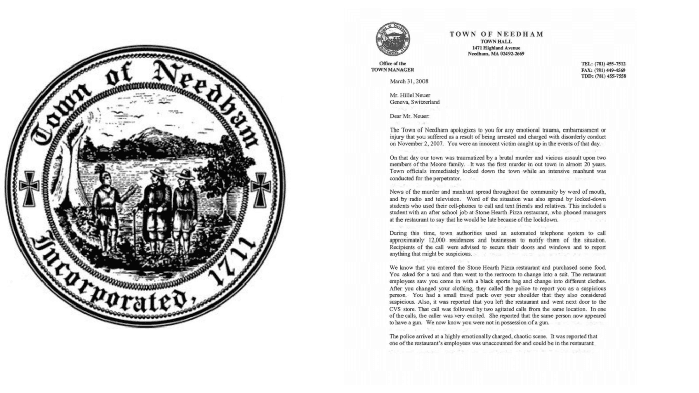 “Mr. Neuer was an innocent victim who went to a restaurant in Needham and was traumatized and almost killed,” said Neuer’s attorney David G. Eisenstadt. On March 31, 2008, the Town of Needham, on behalf of the police, sent Mr. Neuer a full apology, saying he was “an innocent victim caught up in the events of that day.” Following is the full text of the apology.