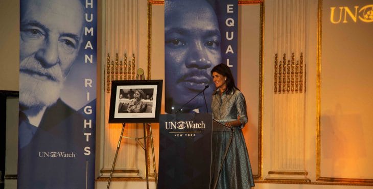NEW YORK, December 7 – At its first-ever Gala Dinner in New York City, the Geneva-based human rights organization UN Watch presented its 2019 Eleanor Roosevelt Award to U.S. Ambassador Nikki Haley, in recognition of her “uncommon courage in defense of the founding principles of the United Nations Charter,” and for “standing up for truth, fairness and human rights.”