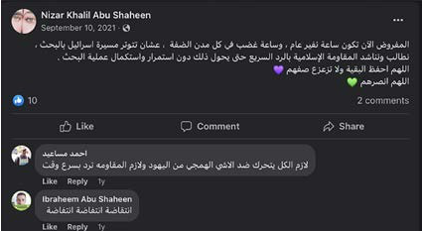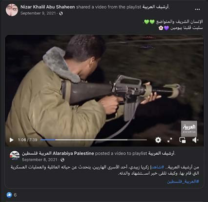 In September 2021,when six convicted terrorists escaped from Israeli prison, Nizar Khalil Abu Shaheen posted praise and encouragement for the leader Zakaria Zubaidi, describing him as an “honest and humble person” who“stole our heart.” Zubaidi, considered a “symbol of the Intifada,” is the former Jenin chief of the Al-Aqsa Martyrs’ Brigades. In a 2005 interview, he assumed responsibility for the 2002 Beit She’an attack that killed 6 people— David Peretz, 48; Haim Amar, 56; Shaul Zilberstein, 36; Ehud (Yehuda) Avitan, 54; Mordechai Avraham, 44; and Yaakov Lary, 35. One of Abu Shaheen’s Face-book posts below endorsed a call to violently resist the Israeli army’s efforts to locate and re-arrest the escaped convicts.