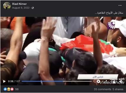 On August 9, 2022, Riad Nimer posted a video of terrorist Ibrahim al-Nabulsi’s funeral procession with a caption lionizing Nabulsi as a “pure soul.” The video likewise refers to Nabulsi’s “pure soul,” calls him a “martyr,” and states that he is one of the “noblest of heroes.” Furthermore, the video posted by UNRWA teacher Nimer concludes by endorsing a call for others to follow in Nabulsi’s footsteps—“peace unto…martyrs who have com- manded us tofollow the path they had taken.”