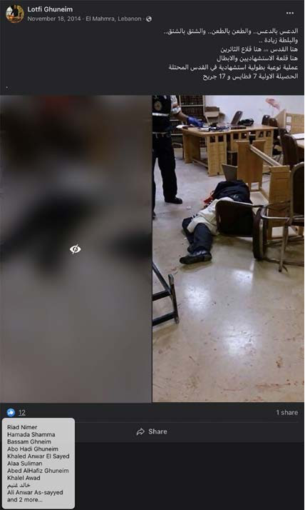On November 18, 2014, Riad Nimer liked a post praising the gruesome Jerusalem synagogue axe and shooting attack, in which two Palestinian terrorists murdered five Jewish worshippers and a responding Druze police officer with axes, knives, and a gun. The post lauds the attack as “a unique and heroic act of self-sacrifice [suicide attack].” The post also rejects Israel’s legitimacy as a state by claiming the attack was perpetrated in “occupied Jerusalem”—even though it was in the Har Nof neighborhood in West Jerusalem, part of Israel since 1948. The post Nimer liked was by an UNRWA teacher previously identified by UN Watch in its 2017 report.