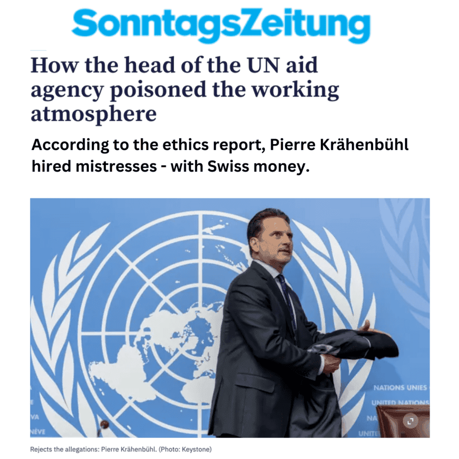 The report is available to the SonntagsZeitung. At the center is an alleged love affair of the Swiss UNRWA chief Pierre Krähenbühl, which created a “toxic working environment” – and which was financially supported by Switzerland.