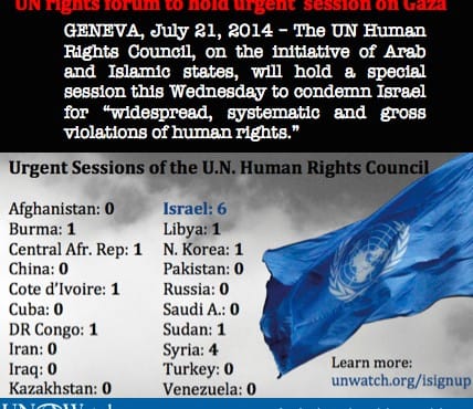 GENEVA, July 23, 2014 – From its inception in 2006 until and including today’s urgent meeting to condemn Israel, the UN Human Rights Council has held 21 special sessions. Of the 17 sessions that criticize countries, more than 30 percent have been on Israel. They are examined below.