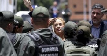 PRESS RELEASE Lilian Tintori (C), wife of jailed opposition leader Leopoldo Lopez waves to supporters next to Venezuelan National Guards as she arrives at the