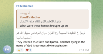 Telegram Nickname: FR Mohamed On October 7th, FR Mohamed commended the Hamas terrorists for learning that “dying in the name of God is our