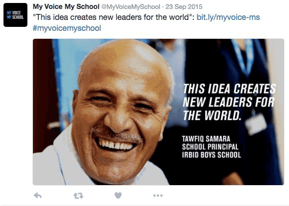 Tawfiq Samara is identified as the principal of Irbid Boys School in Jordan by the twitter account @MyVoiceMySchool. “My Voice My School” is an UNRWA campaign which organizes Skype calls between classrooms at UNRWA schools in Syria and classrooms in the UK. Samara is also the only authority featured in a promo video for the program.