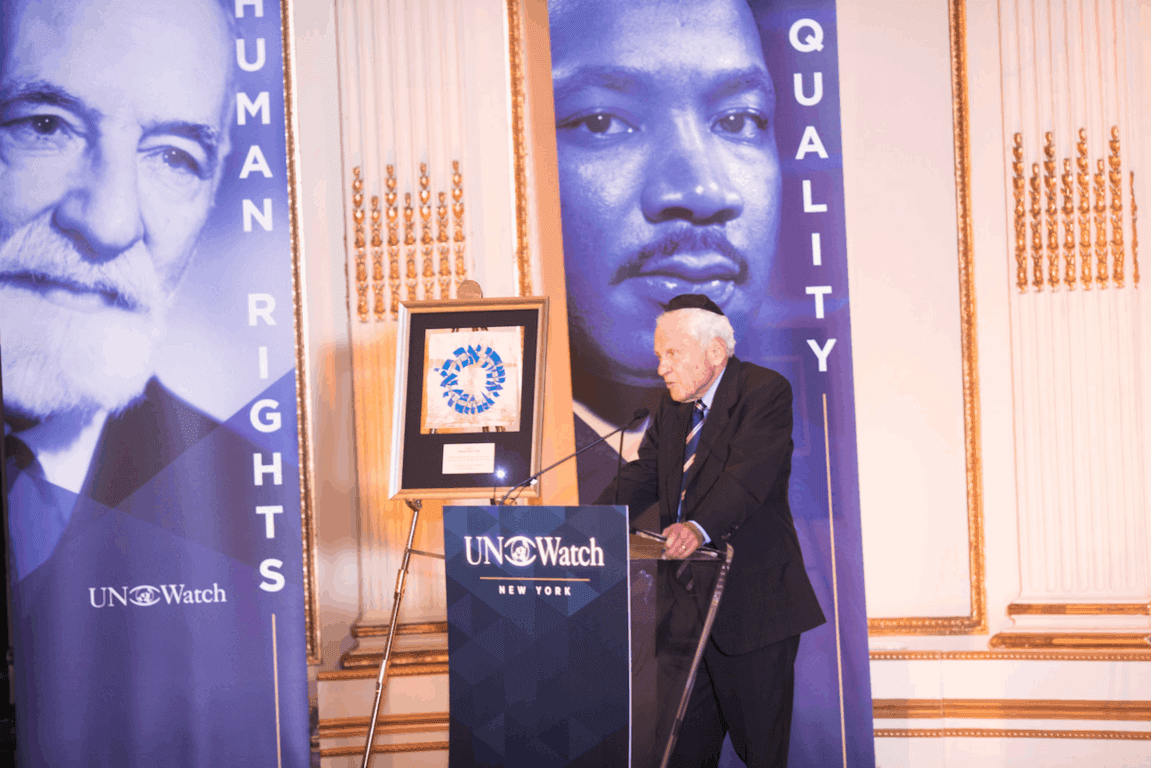 “Tonight on the occasion of his 18 years of devoted service as the Chair of UN Watch, we express our deep gratitude to him for his inspired leadership, his generosity, his wisdom, and his stunning achievements.