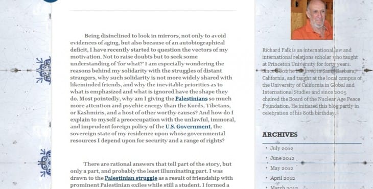 Last week, on 20 July, writing in the same blog where he posted an anti-Semitic cartoon that was condemned last year by British Prime Minister David Cameron, U.N. High Commissioner for Human rights Navi Pillay, and your representative to the U.N., the Human Rights Council’s Special Rapporteur Falk accused “the organized Jewish community,” as well as the U.S. government, of being “responsible for the massive and enduring confiscation of Palestinian land and rights.” (See “For What,” R. Falk, 20 July 2012, at https://richardfalk.wordpress.com.)