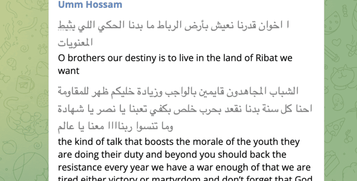 On October 12th, Umm Hossam supported the murderous Hamas terrorists for “doing their duty and beyond.” She called on other group members to “back the resistance,” meaning Hamas, until “either victory or martyrdom.” By victory, Umm Hossam meant “living in the land of Ribat [Palestine],” which she described as “our destiny.” By Palestine, she meant sovereign Israeli territory, not her current residence of Gaza.