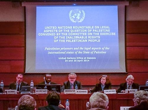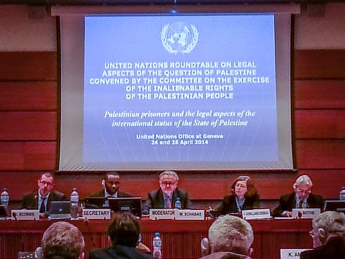Speakers at the “Roundtable on Legal Aspects of the Question of Palestine,” included top UN officials in Geneva; Issa Qaraqe, the Palestinian Authority Minister for Prisoners’ Affairs, who made the outrageous allegation that Israeli pharmaceutical companies conducted experiments on over 1,000 Palestinian detainees; and pro-Iranian law professor William Schabas, who recently participated in the “Russell Tribunal,” a kangaroo court against Israel.