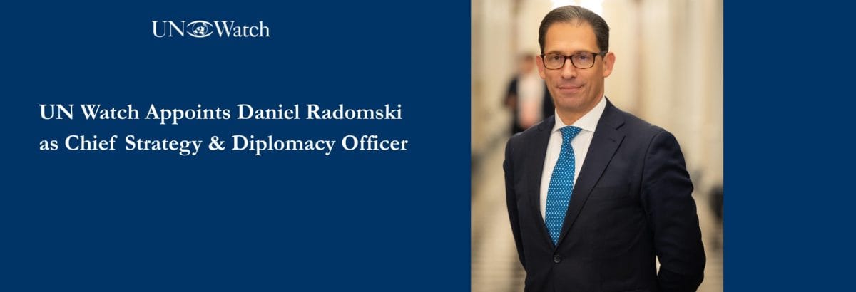 In his new role at UN Watch, Radomski will advance the organization’s strategic plan, oversee diplomatic engagement at the United Nations in Geneva, expand international partnerships, strengthen outreach to governments and parliaments, and grow the community of supporters who sustain its mission.